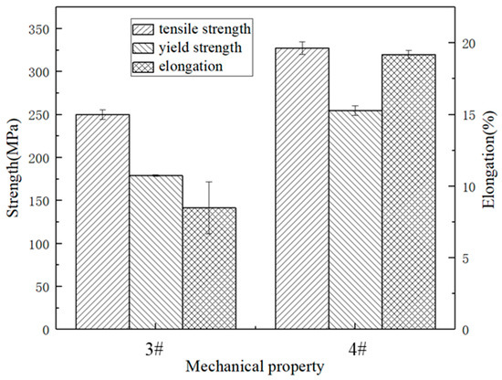Due to the obvious cracking behavior of the samples when the content of Sc and Zr were low, only the sample 4 without cracks and the sample 3 with few cracks were carried out the tensile test. As shown in Table 2 and Figure 13, the tensile strength of the sample 4 is 327.3 ± 7.1 MPa, the yield strength is 254.7 ± 5.5 MPa, and the elongation is 19.2 ± 0.3%. The tensile strength of the sample 3 is 250.0 ± 5.3 MPa, yield strength is 179.0 ± 1.0 MPa, and the elongation is 8.5 ± 1.8%. Although the mechanical properties of the sample 3 are relatively low, it has stable performance and good plasticity. It is mainly due to the fact that there are fewer cracks in its microstructure, and the cracking direction is the same as the tensile direction. As shown in Figure 5 and Figure 6, the grains of sample 4 are fine, and some of grains are nano-sized. According to the Hall-Patch formula: