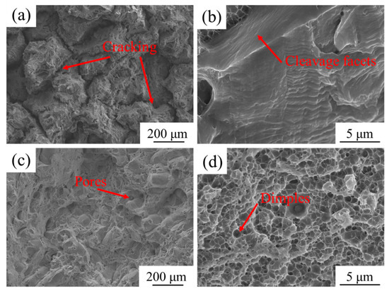 where σs is a constant which is roughly equivalent to the yield strength of a single crystal, and K is a constant which represents the degree of influence of grain boundaries on strength. The smaller the grains, the higher the yield strength. When the grains are plastically deformed, the smaller the grains, the smaller the distance from the dislocation source on the slip surface to the grain boundary. And the smaller number of packed dislocations, the lower the stress concentration caused. In addition, when the grain size is small, the difference of the degree of strain between inside the grain and the vicinity of the grain boundary is small, which will make the grains deformation is more uniform. So, there is more difficult to crack due to stress concentration, and the sample 4 has better plasticity. As shown in Figure 13, the fracture surface of the sample 4 is a micron-scale dimple-like morphology, which is one of the reasons for its good mechanical properties. Obvious cracks can be observed on the fracture surface of the sample 3. The fracture surface is composed of many cleavage steps and a small amount of micron-level dimple-like structure. This is a brittle-ductile mixed fracture. The existence of cracks, massive pores and coarse grains determine that the mechanical properties of the sample 3 is significantly lower than those of the sample 4. Compared to Zhu’s studies [39], the strength of the sample 4 is relatively low. This is mainly due to the difference in composition, especially the difference in the content of Cu, which has a strengthening effect for 7xxx aluminum alloy. And improving the mechanical properties of the samples is one of the directions of our follow-up experiments.
