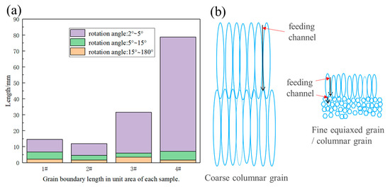 (a) Grain boundary length in unit area corresponding Figure 12, (b) Schematic diagram of grain boundary feed channel changes after refinement.