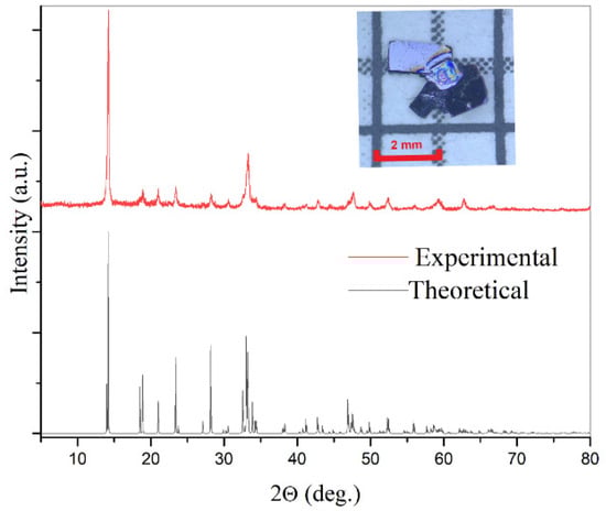 Powder X-ray diffraction results of KCrP2S7, the insert shows the optical microscope photo of selected KCrP2S7 crystals. The crystals were manually cut and selected for properties measurements.