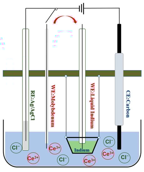 The experiments in this chapter employ a three-electrode system to study the electrochemical behavior of Ce3+ on indium cathode, the active liquid indium electrode is used as the working electrode, and the liquid In electrode is made by placing the liquid indium in a 15 mm × 20 mm alumina crucible with a mass of 5 g of indium. The specific electrochemical redox process is shown schematically in Figure 1. The reference electrode is composed of corundum tube containing silver wire (d = 1 mm, 99.99% pure silver) and AgCl (1 wt.%, molar fraction of 0.0039) of corundum tube, and the ratio of salt in the reference electrode was KCl-LiCl (3:2 wt.%). The silver wire was polished with SiC sandpaper and inserted into the melt to obtain a more accurate chemical reaction. CeCl3 with a concentration of about (2.80 wt.%) and In 4 g were simultaneously placed in a crucible containing KCl-LiCl eutectic salt and the furnace temperature was raised to 823 K. The auxiliary electrode was composed of a 3 mm glassy carbon rod (SU-2000). The electrode potentials during the experiments were used (vs. Ag/AgCl) as a reference.
