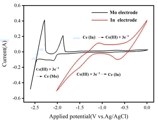 Comparison between cyclic voltammetry of LiCl-KCl-CeCl3 melt at 723 K at molybdenum and liquid indium metal electrodes, respectively; sweep rate: 100 mV s−1.
