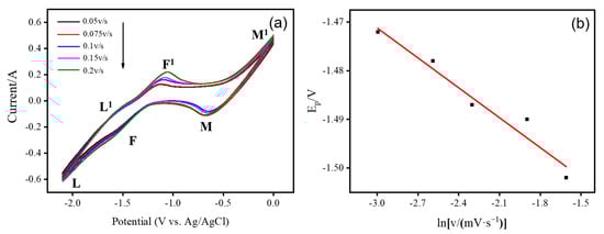 The peak potential and peak current measured by CV versus sweep rate are important techniques to determine the reversibility of the reaction process, and systems in which the peak potential does not vary with the sweep rate usually exhibit reversibility. In this paper, the mechanism of the Ce3+/Ce reaction in an insoluble–soluble system is investigated by analyzing the CV at different potential scanning rates. The natural logarithmic function of the peak cathode potential and the scan rate showed regular changes, and the type of reaction control could be judged. The CV on the liquid metal indium electrode in LiCl-KCl-CeCl3 (3.0 wt.%) melt at different scan rates are shown in Figure 3a. We clearly find that the cyclic voltammetry in the figure gives mainly three pairs of redox peaks, where peaks M and M1 correspond to the redox potential of the In electrode. Peaks F and F1 correspond to the redox potential of Ce on the liquid metal In electrode. L and L1 correspond to the deposition and dissolution processes of Li on the In electrode. Here, we focus on the redox process of Ce on a liquid metal In electrode. As the scan rate increases from 50 mV·s−1 to 200 mV·s−1, the cathode peak potential changes significantly, with the potential moving from −1.472 V to a more negative −1.502 V. At the same time, the peak current shifts gradually in a more negative direction with the increase in scan rate. Figure 3b shows the curve of the cathode peak potential (EP,C) versus the logarithm of the sweep speed (lgv), from which it can be seen that the cathode peak potential and the sweep speed are linearly related, so it can be determined that the redox reaction of Ce3+ on the liquid metal indium electrode is irreversible. Moreover, both the results we obtained and those reported in the literature exhibit irreversible reactions at liquid metal gallium electrodes [].