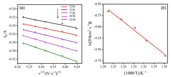 Figure 4a represents the relationship curves between the peak cathode current and the square root of the sweep rate at different temperatures. From Figure 4a, it can be seen that the peak current value of the cathode is linearly related to the square root of the sweep rate, and this result can indicate that the mass transfer during the reduction of Ce3+ on the surface of the liquid metal indium electrode to form the Ce-In alloy is controlled by diffusion. The obtained experimental numbers were substituted into Equation (2), and the diffusion coefficients of Ce3+ on the liquid metal indium electrode in LiCl-KCl melts at different temperatures were calculated and included in Table 2.