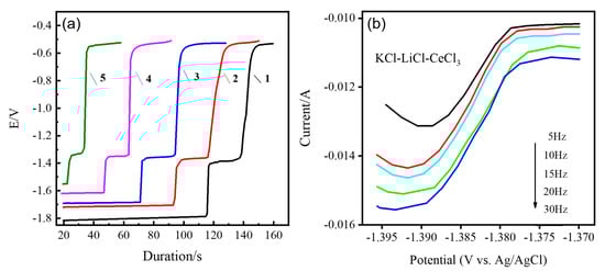(a) Potential energy (vs. Ag/AgCl) versus time in 3LiCl-2KCl-CeCl3 melts at different temperatures on liquid metal indium electrodes after short-time polarization under inert atmosphere conditions. Current—80 mA; Temperature: 1—723 K; 2—753 K; 3—773 K; 4—803 K; 5—823 K. (b) SWV curves of Ce3+ on liquid metal indium electrode.