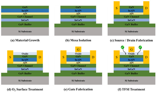 Schematic of the fabrication process for InAlN/GaN HEMT on Si substrate: (a) material growth, (b) mesa Isolation, (c) source/drain fabrication, (d) O2 surface treatment, (e) gate fabrication, (f) TFSI surface treatment.