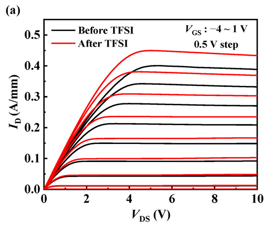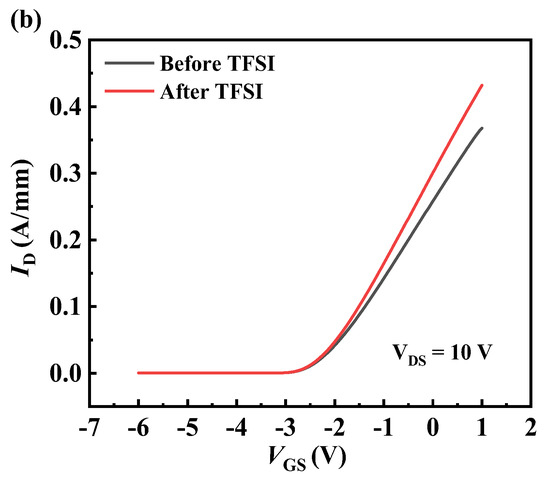 (a) I-V output characteristics of InAlN/GaN HEMT before and after TFSI treatment; (b) Transfer characteristics at VDS = 10 V of InAlN/GaN HEMT before and after TFSI treatment.