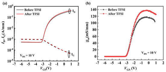 (a) Transfer characteristics in log-scale at VDS = 10 V of InAlN/GaN HEMT before and after TFSI treatment; (b) Transconductance at VDS = 10 V of InAlN/GaN HEMT before and after TFSI treatment.