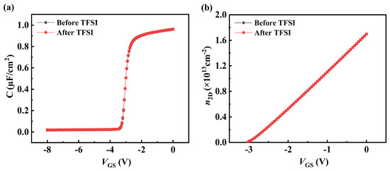 (a) Measured gate capacitance of InAlN/GaN HEMT before and after TFSI treatment; (b) Two-dimensional electron gas electron density (n2D) of InAlN/GaN HEMT before and after TFSI treatment.