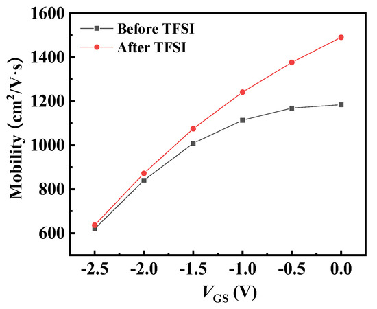 Here, e is the electron charge, VDS and IDS are the drain-source voltage and current, respectively, RD and RS are the drain and source access resistance, respectively, and n2D0 and μn0 are the sheet density and electron mobility, respectively, at VGS = 0 V. To reduce the influence of the lateral field from the drain voltage on the gate channel, the low drain voltage of 0.1 V was used for the electron mobility extraction. As shown in Figure 6, a significant improvement in the electron mobility was observed after TFSI surface treatment.