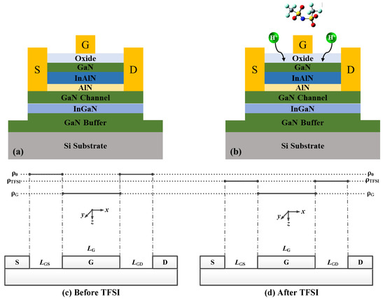 The electron mobility of the InAlN/GaN HEMTs is determined by the channel carrier scatterings, which includes polar optical phonon (POP), acoustic phonon (AP), interface roughness (IFR), dislocation (DIS), and polarization Coulomb field (PCF) scatterings [28,29,30]. The electron density (as shown in Figure 5b) of the InAlN/GaN HEMT before and after TFSI was almost identical, and the low channel field at VDS = 0.1 V could not change the electron temperature. Therefore, POP, AP, IFR, and DIS scattering were unvaried after TFSI treatment [6]. Figure 7a,b show the schematic of the InAlN/GaN HEMT before and after TFSI surface treatment. Because of the large molecular structure, the TFSI molecule cannot diffuse through the oxide layer, which protects the GaN surface from becoming contaminated with larger TFSI molecules. However, the H+ in TFSI could easily diffuse through the oxide layer [25,31]. Due to the spontaneous polarization of the InAlN barrier, there are polarization electric fields in the InAlN barrier, resulting in the negative polarization charges in the top and positive ones in the bottom of the InAlN barrier. The H+ ions are near the top of the InAlN barrier and can neutralize the negative polarization charges in the top of the InAlN barrier, leading to the reduced strength of the electric field through the InAlN barrier. The decrease in the polarization electric field means a decrease in the polarization charges of the InAlN barrier under the access region, resulting in a decrease in the PCF scattering.