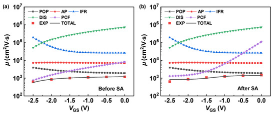 The momentum relaxation rate due to PCF, POP, AP, DIS, and IFR scatterings (τPCF, τPOP, τAP, τDIS, and τIFR) can be calculated by the two-dimensional scattering theory [29,35]. The electron mobility limited by different scattering mechanisms then can be calculated by μ = eτ/m* and the total electron mobility under the gate region can be obtained with different scattering mechanisms by using μn = e(τPOP + τPCF + τAP + τDIS + τIFR)/m*. Here m* is the electron effective mass. Figure 8 shows the calculated results of the electron mobility before and after treatment. Firstly, the extracted total electron mobility agrees well with the measured results, demonstrating the accuracy of extraction process. The mobility limited by POP, AP, DIS, and IFR scattering is almost identical before and after TFSI treatment. This means that the TFSI surface did not change the scattering strength of them. Meanwhile, the electron mobility limited by PCF scattering shows higher values after TFSI. This further confirms that the PCF scattering is suppressed with the treatment, and it dominates the improved electron mobility of the InAlN/GaN HEMTs.