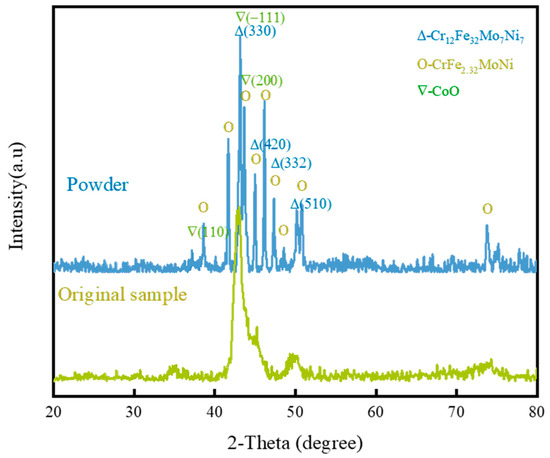 Surface XRD patterns for the FeCoNiCrMo powder and the FeCoNiCrMo coatings.