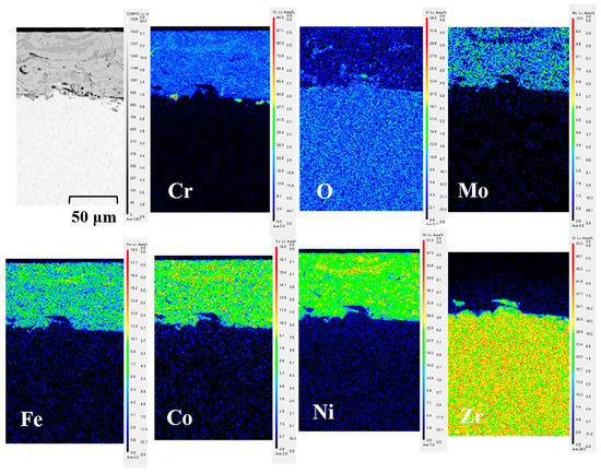 It is seen from Figure 6 and Figure 9 that the cross-sectional morphology of the specimens after 15 min of oxidization was mainly divided into some layers: the Cr2O3 oxide layer generated on the surface, the FeCoNiCrMo coatings, and the zircaloy-4 substrates. It is seen from Figure 6 that there were no clear vertical cracks in the morphologies of the coatings, only some cracks and pores, but the cracks did not extend to the interface. There were voids and cracks in the FeCoNiCrMo layer. It was due to the existence of the Mo element. Mo formed MoO3 with oxygen elements, and MoO3 was easily volatilized at high temperatures. The volatilized MoO3 formed pores in the FeCoNiCrMo coatings, and Mo-O had high stress. After volatilization, it led to large stress and cracks in the oxide layer, which promoted the formation of cracks. It was found that the presence of the Mo element was not conducive to the oxidation resistance and high-temperature stability of the FeCoNiCrMo coatings. However, due to the formation of a dense and protective Cr2O3 layer on the FeCoNiCrMo coatings during the oxidation process, the diffusion of elements was hindered, so the cracks caused by the volatilization of MoO3 were also reduced. It is seen that compared with Figure 3 and Figure 6, the oxygen content in the FeCoNiCrMo coatings was still slightly lower than that in the zircaloy-4 substrates. It indicated that oxygen penetrated the FeCoNiCrMo coatings, but because of its low solubility in the coatings, its contents in the coatings were low. Compared with the original specimen, most of the oxygen elements in the FeCoNiCrMo coatings after oxidation were concentrated in the surface oxide layer. The thin but dense Cr2O3 layer shows that the FeCoNiCrMo coatings provided effective protection.
