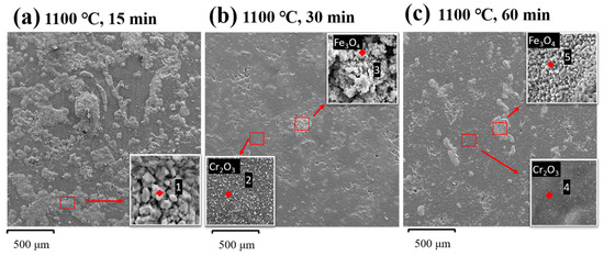 Figure 5 shows the surface morphologies of the FeCoNiCrMo coatings after oxidation at 1100 °C for 15 min, 30 min, and 60 min in a steam environment, and Table 4 shows the corresponding elemental compositions. In the initial stage of the oxidation process, the formation of the oxide layer depended on the chemical reaction. While in the further growth stages of the oxidation process, the formation of the oxide layer depended on the diffusion of elements to the substrate surface and the migration of ions to the oxide layer. Under different oxidation times, the oxidation results were significantly different, and the phase composition of the coating system changed, which affected the high-temperature oxidation resistance of the coatings. It can be observed by SEM that many phases with different morphologies were formed on the surface of the FeCoNiCrMo coatings because the elements with low activation energy were preferentially oxidized (selective oxidation) at the beginning of the oxidation reaction. After 15 min oxidation, a uniform Cr2O3 layer was formed on the surface of the FeCoNiCrMo coatings, and there were many convex oxides on the surface, such as NiCr2O4 and Fe3O4. The free energy of possible oxide formation at 1100 °C (ΔGf, kJ/mol) was, from small to large, Fe3O4 < NiCr2O4 < Cr2O3 < MoO3 < CoO < NiO [33].
