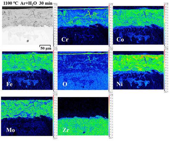 EPMA elemental mapping of the FeCoNiCrMo coatings after 15 min of oxidation at 1100 °C in a steam environment.