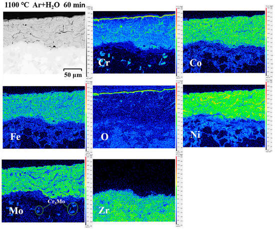 EPMA elemental mapping of the FeCoNiCrMo coatings after 60 min of oxidation at 1100 °C in a steam environment.