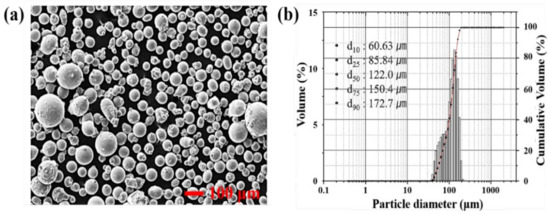 (a) Appearance morphology, and (b) particle size distribution of Fe-Cr-Si powder.