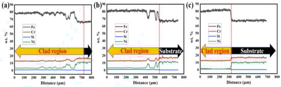 Figure 4 shows the results of the line component analysis through the EPMA of each clad according to the laser traverse speed. Line analysis was performed along the red line from the upper regions of each cladding to a specific area in the substrate, as shown in Figure 3. The powder constituting the clad was mainly composed of Fe, Cr, and Si. Therefore, only the Fe, Cr, Si, and Ni components were analyzed to confirm the presence or absence of the diluted Ni component from the substrate to each clad region. As shown in Figure 3a, the bright band formed at the interface of the clad region, and the substrate was transferred to the upper region of the clad in the 12 mm/s specimen with the slowest laser traverse speed. It was observed that the Ni component was diluted to the upper region of the clad, and other Fe, Cr, and Si components also showed irregular dilution rates with decreasing laser traverse speed. However, as the laser traverse speed increased, the bright band’s position changed to the lower region of the clad, which was the interface between the substrate and clad region. In addition, the dilution amount of Ni in the clad region decreased, owing to the decline in the laser traverse speed. Additionally, the region showing irregular periods of Fe, Cr, Si, and Ni components was limited to the lower position of the clad. Therefore, the bright band in the clad region observed in Figure 3a was caused by the dilution of the Ni component of the substrate, generated by the heat input applied during the cladding.