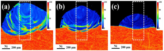 Ni segregation of Fe-Cr-Si single-line clads at various laser traverse speeds: (a) 12 mm/s, (b) 14 mm/s, and (c) 16 mm/s.