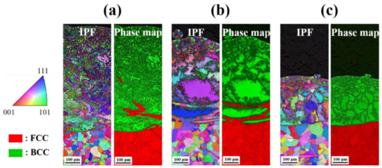 Figure 6 shows the phase transformation behavior of each clad region with increasing laser traverse speed. Phase analysis using EBSD was performed from the upper region of each cladding to the region containing a part of the substrate along the box. This analysis is indicated by the white dotted line in Figure 5. The substrate and cladding regions of each specimen were composed of face-centered cubic (FCC) and body-centered cubic (BCC) phases, respectively, owing to the difference in the content of austenite-stabilizing element such as Ni. Although the heat input was decreased by increasing the laser traverse speed, the range of the unmixed zone in which the FCC phase of the substrate reached the clad region was limited to the region below the cladding. The unmixed zone was the region formed because a part of the substrate was not completely melted while the powder was melted during the cladding process. In Figure 5, the orange region in which parts of the substrate and cladding were irregularly mixed was the FCC region at the interface between the substrate and cladding region. In addition, the area separated by a lighter color than the orange region represents the degree of dilution of the Ni component. The FCC region observed in the cladding region of each specimen identical to the Ni segregation region in orange (See Figure 5). Further, we confirmed that the unmixed zone, which started at the interface between the substrate and clad region, propagated to the central region (FCC fraction: 16.5%) of the clad in the 12 mm/s specimen with the highest heat input. Additionally, because the Ni component was diluted in the entire region of the clad, as shown in Figure 5a, dense martensite was formed in the entire clad region (Figure 6a). However, the range of unmixed zone formation was limited to the lower region (FCC fraction: 5.4%) of the clad bead in the 14 mm/s specimen. As the Ni dilution was concentrated in the upper/lower regions of the clad (Figure 5b), dense martensite was locally generated in the upper/lower regions, as shown in Figure 6b. As the dilution of Ni hardly occurred (FCC fraction: 1%) in the 16 mm/s specimen with the lowest heat input, the substrate and cladding regions comprised FCC and BCC, respectively, as shown in Figure 6c. In the 16 mm/s specimen with the lowest heat input, it was confirmed that the diluted Ni component was locally segregated at the grain boundary between the primary δ-ferrites to form martensite. The primary δ-ferrites became coarser with increased heat input in the 14 mm/s specimen. In the 12 mm/s specimen with the highest heat input, the primary δ-ferrites were expected to be coarser; however, the results were contrary to expectations. In the specimen with low heat input, because the dilution rate of the Ni component was low, dense martensite was mainly formed at the grain boundaries of the primary δ-ferrites and in the upper region of the bead. Conversely, dense martensite was formed in the entire cladding region, except for the local area in the 12 mm/s specimen, due to the large amount of Ni dilution in that region. These results show that the dilution of Ni, rather than the rapid cooling rate of the laser cladding, was the driving force for martensite formation. In general, it is known that the fraction of δ-ferrite and martensite is determined according to the cooling rate in welds of Fe-Cr-based low-alloy steel [19,20,21]. In the welds of the gas tungsten arc welding (GTAW) with high heat input and laser welding with low heat input, it was confirmed that the δ-ferrite fraction of laser weld with a relatively fast cooling rate was higher than that of GTA weld [20]. This result occurred because the high-temperature δ-ferrite was not sufficiently transformed into austenite in the two-phase region of δ + γ during cooling because equilibrium solidification was not possible due to the fast cooling rate after welding [21]. Therefore, the residual δ-ferrite fraction at the interface between the molten pool and the base metal with a fast cooling rate is higher than the central region of the weld and upper clad bead with a slow cooling rate [21]. In addition, the austenite-stabilizing element was added to improve the corrosion resistance of Fe-Cr-based low-alloy steel, and the fraction of retained austenite was increased because the martensite initiation (Ms) temperature was decreased due to the addition of Ni content higher than 2% [25]. Therefore, it is possible to explain the effect of the cooling rate and Ni dilution by the laser traverse speed on the microstructure behavior of the clad specimen.