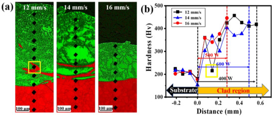 Hardness behavior for various laser traverse speeds (12−16 mm/s): (a) hardness measurement area, (b) hardness distribution in the clad specimens.