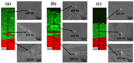 Correlation between the hardness distribution and microstructure of a specific area in each clad specimen at various laser traverse speeds: (a) 12 mm/s, (b) 14 mm/s, and (c) 16 mm/s.