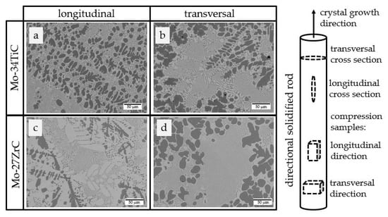 Figure 1a shows the microstructure for Mo-34TiC parallel to growth direction (longitudinal) consisting of near-eutectic Mo/TiC colonies elongated along the growth direction as well as larger dendritically grown TiC phases. Hence, near-eutectic alloy composition is achieved wherein areas of primarily solidified TiC phases are embedded in a Mo solid solution (Moss) phase. Following the solidification sequence, eutectic cells form from the residual melt. Figure 1b represents a cross section of normal to growth direction (transversal), where equiaxed eutectic colonies and dendritic phase regions with different size and shape are observed. Figure 1c depicts the microstructure of the Mo-27ZrC alloy, where especially in the longitudinal section, larger Moss regions appear in addition to larger ZrC phase regions as well as eutectic regions of Mo/ZrC. As can be seen in Figure 1d, the primarily solidified ZrC is surrounded by a fine eutectic structure.