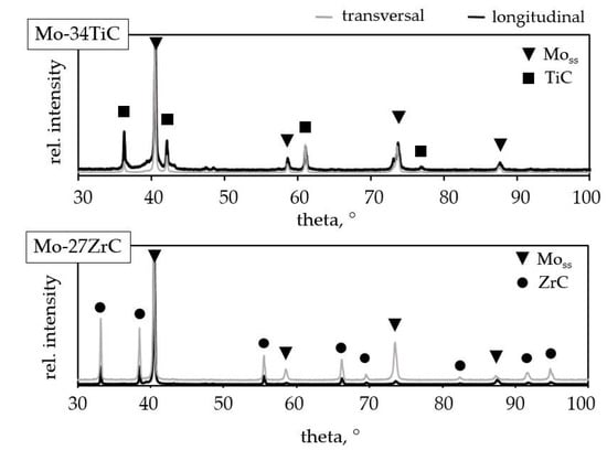 In direct comparison, the Mo-27ZrC alloy shows a more promising performance in high temperature compression, since the temperature dependence of the yield strength of the transversal specimen is lower and it allows much more plastic deformation than Mo-34TiC. In this context, the somewhat higher proportion of the Moss phase and the distribution of eutectic regions display a decisive impact.