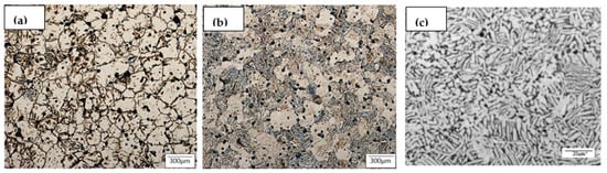 (a,b) show the (α) alpha and (β) beta phases of Ti-5Mn and Ti-10Mn alloys (400×), respectively, and (c) shows the optical structure of Ti6Al4V alloy (400×).