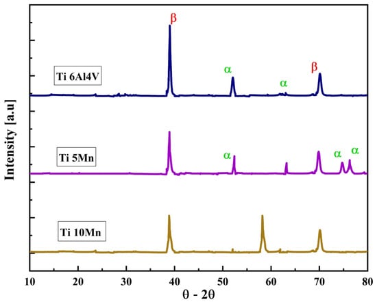 Referring to the XRD patterns in Figure 2, the Ti5Mn and Ti6Al4V alloys contained both alpha and beta phases, whereas only the beta phase is observed in the case of Ti10Mn alloy, which confirms that the beta phase of the alloy increases with the increase in manganese content. This is because manganese stabilizes the β-phase [,].