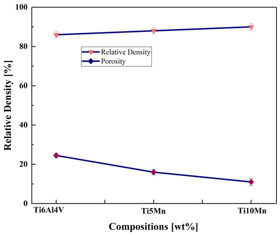 Figure 3 presents the relative densities and porosity level of the titanium-based alloys, which were calculated by using Equations (1) and (2). The direct relation of relative densities with the manganese content was observed, which results in a decrease in porosity level, i.e., the densification is maximum.