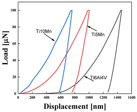 Figure 4 reveals the load (P) versus displacement (h) curve of Ti5Mn, Ti10Mn, and Ti6Al4V, respectively, obtained during the nanoindentation tests. For all the specimens, the P versus h curve was observed to be smooth, but in the case of Ti5Mn, there was a considerable decrease in depth. The decrease specifies an increment in the hardness value of the newly designed alloy. Generally, the load-displacement curve depends on several factors, such as the force applied, the material onto which testing will be done, and environmental conditions during nanoindentation testing. Overall different materials possess different shapes of load versus displacement curves, and in this research, the curve profile shows that the material performs in both elastic and plastic mode. The reason behind the shifting of curves towards the left indicates that among all alloys, Ti5Mn efficiently reduced the displacement from 1200 to 600 (in the case of Ti6Al4V) because of the strengthening mechanism and load sharing capability. The Ti5Mn curve shows the least displacement, although Ti6Al4V indicates the uppermost maximum displacement and the maximum elastic modulus of 130.13 GPa. The gradient of unloading and modulus are strictly connected to the stiffness, which results in an increase in the modulus of elasticity. The loading part of the P versus h curve joins the complex reaction of the material to strain including elastic, although the unloading part of the curve for maximum materials contains mostly elastic recovery [,].