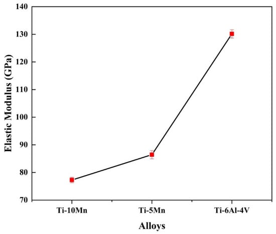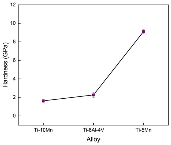 Solid solution hardening has an impact on both the hardness and elastic modulus properties of Ti(5–10)Mn, which is due to the presence of Mn and the quantity of the ω phase, a thermal in the alloys. Contrarily, the volume section of the omega (ω) phase decreases with an increase in Mn content, which results in a reduction in both nanohardness and Young’s modulus properties [], as shown in Figure 6.