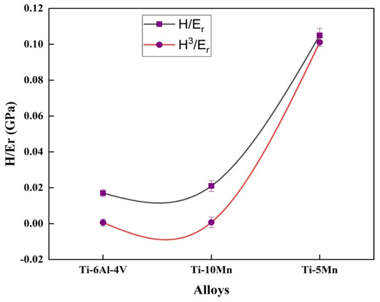 Figure 7 shows the comparative values of H/Er and H3/Er2 ratios for all alloys, calculated by using Equation (4). Ti-5Mn has a high value of yield pressure (resistance to plastic deformation in the presence of load) and an H/Er ratio. The enhancement in hardness (HIT) and reduced elastic modulus (Er2) value of Ti-5Mn shows enhanced wear resistance and resistance to plastic deformation.