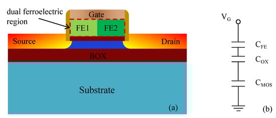 The schematic of the new DFR-NCFET based on the FDSOI structure is shown in Figure 1a. Compared with the traditional FDSOI NCFET, the ferroelectric layer is composed of two ferroelectric materials (FE1 and FE2) in the proposed DFR-NCFET. By changing the ferroelectric parameters in different regions of the ferroelectric layer, the DFR-NCFET obtains a non-uniform voltage amplification effect by the dual ferroelectric layer, which significantly improves the control ability of the gate to the channel and optimizes the subthreshold swing of negative capacitance transistors.