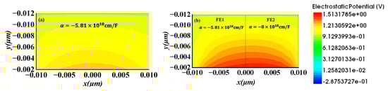 In this paper, the ferroelectric parameters of the conventional ferroelectric region are defined as α = −5.81 × cm/F, β = 3.29 × cm5/(), and γ = 2.17 × cm9/() []. The ferroelectric parameters of the FE1 region follows these parameters. In addition, the ferroelectric parameters of FE2 region are variable. Firstly, the α of FE2 is changed to = −7 × cm/F, = −8 × cm/F, = −9 × cm/F, and = −10 × cm/F, while keeping the remaining parameters such as ferroelectric parameters β and γ the same as the FE1 region. Then, the β of FE2 is changed to = 1.645 × cm5/(FC2), = 3.29 × cm5/(FC2), = 1.645 × cm5/(FC2), and = 3.29 × 1021 cm5/(FC2) while keeping the remaining parameters such as ferroelectric parameters α and γ the same as the FE1 region. The thickness of the ferroelectric region (TFE) of the dual ferroelectric region is fixed at 10 nm, and the other structural parameters of the negative capacitance transistor are given in Table 1.