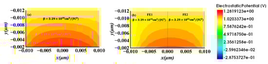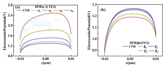 Figure 3 shows the potential distributions of the ferroelectric region for the CFR-NCFET and the DFR-NCFET with variable β. The ferroelectric parameter β of the ferroelectric region in the CFR-NCFET and the FE1 region in the DFR-NCFET is 3.29 × cm5/(), and it is 3.29 × cm5/() in the FE2 region of the DFR-NCFET. The figure shows that for the dual ferroelectric region, the potential value at the bottom of the ferroelectric layer decreases with the increase in β in FE2, and the distribution of potential lines within the ferroelectric region is sparser. Therefore, the voltage amplification effect of the dual ferroelectric region with an increased β in FE2 is weakened compared to the conventional ferroelectric region.