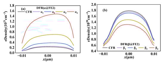 Electron concentration distribution on the channel surface of the CFR-NCFET and DFR-NCFET, (a) variable α in FE2 region, (b) variable β in FE2 region.