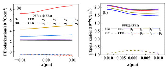 The polarization intensity along the bottom of the ferroelectric region for the DFR-NCFET in the on/off state is given in Figure 6. From Figure 6, it can be seen that the polarization intensity in each transistor is almost the same when the transistor is under the off state, while the polarization intensity flips from negative to positive during the transistor operating from the off state to the on state. In Figure 6a, a significant increase in the on-state polarization intensity with the increase in α, and the non-uniformity of the polarization intensity also increased, the polarization intensity reaches a value of 7.4 × 10−6 C/cm2 in FE1 and 8.4 × 10−6 C/cm2 in FE2, which is much higher than the 2.1 × 10−6 C/cm2 of the CDR-NCFET. In Figure 6b, the on-state polarization intensity decreases with the increase in the ferroelectric parameter β in FE2, the on-state polarization intensity is 1.8 × 10−6 C/cm2 in FE1 and 1.6 × 10−6 C/cm2 in FE2 for the DFR-NCFET with β4. The polarization flip in Figure 6 is consistent with the voltage amplification in Figure 4, reflecting that the polarization flip of the ferroelectric region is the fundamental reason for determining the voltage amplification.