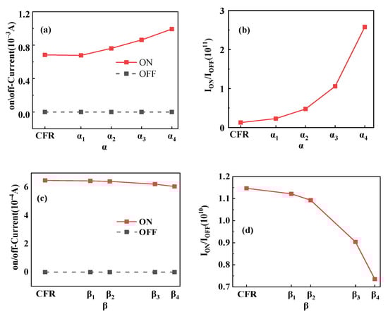 On/off current and on/off current ratio of the CFR-NCFET and DFR-NCFET, (a) on/off current versus α of FE2, (b) on/off current ratio versus α of FE2, (c) on/off current versus β of FE2, (d) on/off current ratio versus β of FE2.