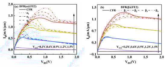 Figure 8 shows the output characteristics curves of the DFR-NCFET compared to the CFR-NCFET with the gate-source voltages (VGS) of 0.3 V, 0.6 V, 0.9 V, 1.2 V, and 1.5 V. From Figure 8a, it can be seen that the DFR-NCFET has higher current in the saturation region when compared to the CFR-NCFET. Which is because of the stronger voltage amplification effect of the dual ferroelectric region. It also can be seen that the saturation current becomes higher as the absolute value of the ferroelectric parameter α is increased. The maximum amplification of the saturation current of the DFR-NCFET reaches 1.53 times of the CFR-NCFET. However, ID trends to be the same when the drain voltage is large enough. The reason is the polarization of ferroelectric layer will be affected by drain voltage under the constant gate voltage, thus inhibiting the effect of NC voltage amplification. Moreover, the potential on the channel surface is decreased with the increase in drain voltage, which leading to the decrease in ID in the output characteristic curve. In Figure 8b, the saturation current of the DFR-NCFET with large β is smaller than the CFR-NCFET, but almost the same at smaller gate-source voltage of larger drain voltage.