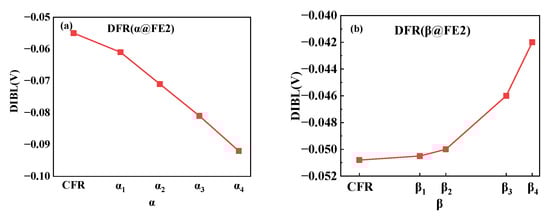 Figure 9 shows the drain induced barrier lower (DIBL) extraction results of the CFR-NCFET and DFR-NCFET with different α and β of FE2. It is obvious from Figure 9a that the negative DIBL of the DFR-NCFET becomes more and more obvious as the absolute value of the ferroelectric parameter α increases. This implies that the DFR-NCFET is increasingly capable of combating short-channel effects as the absolute value of the ferroelectric parameter α increases, thus have great application prospects for short-channel devices. However, it is obvious from Figure 9b that the negative DIBL phenomenon of the DFR-NCFET becomes weaker as the ferroelectric parameter β increases, which means that the DFR-NCFET becomes less capable of combating short-channel effects as the ferroelectric parameter β increases.