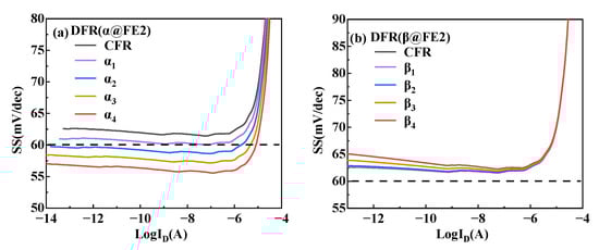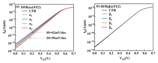 Figure 10 shows the transfer characteristic curves of the DFR-NCFET compared with the CFR-NCFET with a drain voltage of 0.4 V for each transistor. As can be seen in Figure 10a, with the increasing absolute value of the ferroelectric parameter α, the drain current decreases, and the subthreshold swing (SS) of the DFR-NCFET decreases, and as the ferroelectric parameter α increases from α = −5.81 × 1010 cm/F to α4 = −1×1011 cm/F, the subthreshold swing of the negative capacitor transistor decreases from 62 mV/dec to 56 mV/ dec, breaking the subthreshold swing limit of 60 mV/dec. It can be seen in Figure 10b that the subthreshold swing of the DFR-NCFET increases slightly with the increase in the absolute value of the ferroelectric parameter β. With the increase in the ferroelectric parameter β, the subthreshold swing of the transistor increases from 61.7 mV/dec to 62.4 mV/dec, so the ferroelectric parameter β has little effect on the transistor performance.