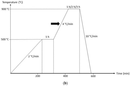 Alkali activator was first prepared by mixing the sodium hydroxide (NaOH) and sodium silicate (Na2SiO3) with a solid-to-liquid ratio of 4:1 by using a mechanical stirrer for 15 min. The alkali activator was prepared 24 h prior to use by mixing 8 M NaOH solution. Then, kaolin and GGBS were mixed together with an alkali activator by using a ratio of 2:1. After that, kaolin-GGBS geopolymer was poured into a 50 × 50 × 50 mm mold size. The geopolymer slurry was vibrated to remove the trapped air, and sealed with plastic at the exposed portion of the mold during the curing stage. The samples were allowed to cure at room temperature for 24 h. After 24 h of curing at room temperature, all samples were then cured for 14 days at 60 °C in the oven. After being cured for 14 days at 60 °C, 3 sets of samples were sintered in LT Muffle Furnace. The sintering process was carried out in two steps of the sintering process: the first step with a temperature of 500 °C and the second step at 900 °C with different heating rates and holding times and 10 °C/min of cooling rates elucidated in Figure 1a,b. The samples were then examined for shrinkage, compressive strength, microstructure analysis, and phase analysis. The sintered samples were labeled according to the parameter of sintering namely as shown in Table 2 below.