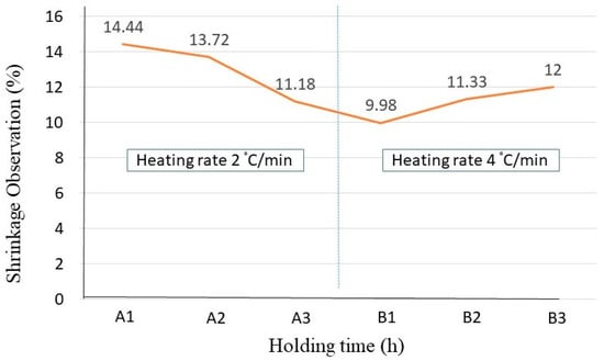 Shrinkage observation on different holding times (1:1 h, 2:2 h, and 3:3 h) and heating rates.