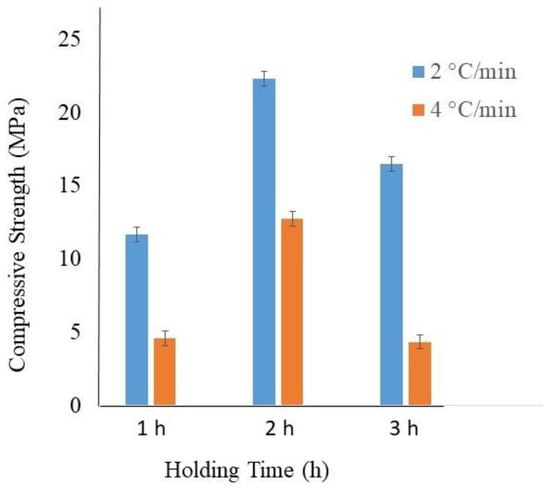 Compressive strength at different holding time (1 h, 2 h, and 3 h).