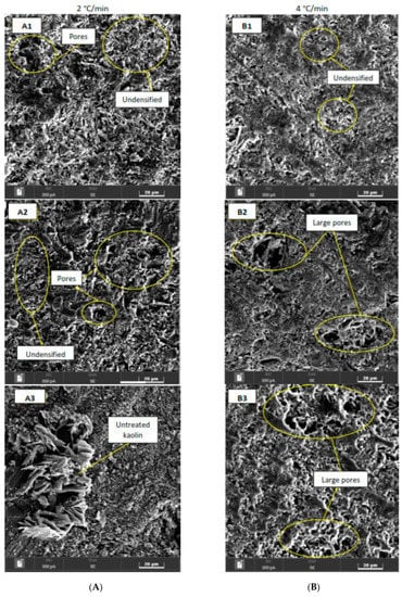 Based on Figure 5, the microstructure of sintered geopolymer when opposed to 2 °C/min resulted in fewer pores and more densified, while the microstructure at 4 °C/min reveals an increased number of pores and untreated kaolin. Sintered geopolymer with 2 °C/min of heating rate and 2 h of holding time is more densified with small pores and the highest compression strength obtained, 22.32 MPa. This is due to the slow heating rate and longer holding time. On the contrary, sintered geopolymer with 4 °C/min and 3 h of holding time resulted in the lowest compressive strength and major cracking. The microstructure of untreated kaolin was observed at 2 °C/min and 3 h indicating that linger holding time for geopolymer did not allow such improvement of the packing density and homogenization of the microstructure during phase transformation [17]. This phenomenon induced the appearance of large pores and therefore led to lower sinterability. During the holding process, the surface energy of the individual particles contacted with one another thus forming a necking and forming a grain hence reducing the empty spaces of pores. The continuous growth of grains initiates grain boundaries, consequently densifying and eliminating the pores. The increase in holding time is due to the convergence of particles, which allows full coalescence of the particles and induces viscous flow which is necessary for densification [18,19]. For the low rate-heated sample, the longer heating step in temperature resulted in more effective particle rearrangement during phase transition from transition to alumina.