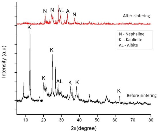 Figure 7 shows the phase transformation of kaolin-GGBS geopolymer before and after sintering at 2 °C/min of heating rate and 2 h of holding time. The main phase obtained before sintering was kaolinite. Kaolinite (Al4(OH)8(Si4O10)) was not visible after sintering. However, nepheline (Si-rich) Na7(Al6Si10O32) occurred after sintering. The presence of nepheline in sintered samples leads to an increase in the compressive strength. The formation of albite and nepheline after sintering was influenced by a reaction between kaolinite and alkali activator. Sodium silicate (Na2SiO3) can provide sufficient silicon ions during the hardening process to promote the activation precursor of geopolymer materials and improve the mechanical properties [20]. The growth from the nuclei will fix the formation of the geopolymer backbone and form the solid framework [21,22]. Albite and nepheline consist of the same elements which are Na, Al, Si, and O. During geopolymerization, the function of Na cations was to balance the negative charges created by the formation of Si-O-Al bonding, or nonbridging oxygen ions remained in the system. Meanwhile. OH- is consumed during the hydrolysis of kaolin. The Na2O content was contributed by the Na2SiO3 solution and NaOH solution. Therefore, most of the gained strength arises from the GGBS in addition to the enhancement effect of the NaO from the alkali activator. The densified area in sintered kaolin-GGBS geopolymer was contributed from Na2O.