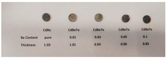 All CBT crystals were grown by the Bridgman–Stockbarger technique. It is a high–pressure and high–temperature technique of growing a crystal. The details describing the growth process were published elsewhere [25]. We prepared crystals with different Be content (x = 0.00, 0.01, 0.03, 0.05, and 0.1). The overpressure of the argon was applied during crystal growth to prevent evaporation. We mixed CdTe and Be high–purity powders in an appropriate proportion and placed them in the graphite crucible, heated to approximately 1315 K for a few hours, and then pulled down at the rate of 2.3 mm per hour. We obtained cylindrical shape crystals that were 8–10 mm in diameter and 40–50 mm in length. We cut the grown ingots perpendicular to the growth axis into plates of approximately 1.5 mm. The samples were first mechanically ground with Al2O3 powder, 10 μm, and polished with the same fine powder of granularity 1 μm. After polishing, we obtained the surface of crystals like a mirror. With one ingot, we were able to obtain up to 10 plates. Each sample’s thickness was measured at five different points (for averaging) using a micrometer device. The thickness of the pieces is presented in Figure 1 in mm; these values were used to calculate the thermal diffusivity of the samples.